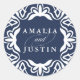 Coloque seus envelopes de casamento, favores e muito mais com nossos elegantes adesivos marroquinos inspirados em marinho e branco. O Round design apresenta seus nomes conectados por um roteiro decorativo e rodeados por uma borda geométrica em branco sobre um fundo azul marinho clássico. Coordena-se com a nossa coleção de convites de casamento Marraquexe em marinho.