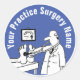 Cartazes engraçados para a sua clínica ou consultório médico. Um adesivo divertido mostra um médico checando os pés do paciente com um estetoscópio. Personalize com o nome da sua prática ou cirurgia. Engraçado desenho de um médico com adesivos.