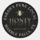 Rótulo preto com abelha heráldica vintage. A palavra HONEY é escrita e refletida numa fonte metálica esmaltada. O nome apiário ou apicultor é escrito em texto curvo ao redor do perímetro superior do rótulo, com a localização abaixo.