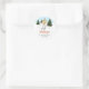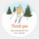 Diga obrigado com estilo com este adesivo de tema de esqui, projetado pela Destei. Com uma ilustração em aquarela de uma menina esquiando pelas encostas nevadas com árvores de abeto verdes sob um céu de inverno azul claro com neve caindo, o adesivo tem espaço para uma mensagem personalizada, tornando-o uma maneira divertida e festiva de mostrar sua gratidão em uma celebração de aniversário de esqui.