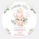 Garotas Rosa Floral Este Pequeno Pinto Aniversário Clássico Redondo Clássico De Aniversário Com Um Porquinho Bonito ou Um Pequeno Porquinho, com o pau de aniversário, com um porco de cor aquática fofo e algumas adoráveis disposições florais. Este pequeno adesivo porquinho é uma maneira fofa para os convidados do obrigado por terem vindo à festa de aniversário do tema porquinho da sua menina.