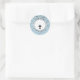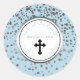 Azul-bebê e cor prateada, adesivos religiosos personalizados para batismo, comunhão, confirmação, etc- Efeito brilhante impresso com pontos falsos de configuração de folha prateada sobre fundo azul pastel. No centro há um círculo branco com bordas metálicas de prata falsas. Lê 'Deus abençoe em letras curvas no topo em azul correspondente e nome de bebê personalizado no fundo em texto curvo e azul. Data personalizada no centro, em coordenação com a letra prateada, com símbolo cruzado por baixo. Nota: Todas as imagens são impressas. Não brilho, confete ou metal. Um jovem elegante sela de batismo ou design personalizado de adereços religiosos. Clique na opção Personalizar para alterar as cores do texto, o tamanho e os estilos de fonte.