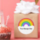 Este adesivo redondo está pronto para ser personalizado com sua própria mensagem, adicione um nome ou seu próprio ditado especial. Ele apresenta uma ilustração retrógrada de um arco-íris em cores brilhantes com seu texto em letras negrito nas nuvens brancas abaixo.