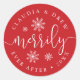 Personalize estes autocolantes vermelhos festivos com os seus nomes e o ano para uma forma chic de terminar os seus cartões de Natal ou os convites para casamentos de Natal e correspondência. Perfeito para recém-casados, este design chic apresenta "alegremente para sempre" numa mistura de letras brancas de caligrafia e tipos de blocos, acentuados com flocos de neve brancos.