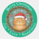 Add an instant touch of holiday cheer to your gifts, cards, or treat bags with this Adorable Christmas Cat Sticker! This festive round label features a sweet, smiling ginger tabby kitten wearing a classic Santa hat. The cat is framed by a lush, beautiful holly wreath adorned with sparkling string lights, a candy cane, a bell, and snowflakes. The outer red border includes the heartfelt holiday greetings: "Merry Christmas" and "Joy * Love * Happiness". Perfect for sealing envelopes, decorating presents, personalizing party favors, or simply showing off your love for cats during the festive season.