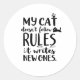 Um design gráfico engraçado e ousado para donos de gatos que sabem que seus animais de estimação estão no comando! Esta arte tipográfica mostra a citação: "Meu gato não segue regras, escreve novas regras." Com um ícone bonito e estilizado de gato e pata impressa, é perfeito para t-shirts, canecas, ou como arte de parede para celebrar a anarquia brincalhona do seu felino favorito.