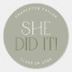 Este verde moderno que ela fez é perfeito para uma festa de formando simples. A design apresenta uma elegante tipografia de vassoura com um toque de estilo sofisticado em verde-claro e leve minimalista. Personalize seu adesivo de favor com o nome do formando e ano de aula.