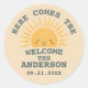 Celebrate with this trendy, customizable baby shower sticker featuring sunshine motifs, pastel rainbows, and playful typography. Perfect for water bottles, laptops, and favors. Personalize with date, family name, and welcoming message for a memorable event.