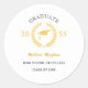 Um design adesivo de festa de formatura simples e elegante apresenta um fundo branco, que inclui uma coroa de riso de ouro, ícone de boné de formatura e tipografia na moda. Este adesivo é perfeito para uma festa de comemoração. Personalize com seu próprio texto, fontes e cores ou remova e comemore sua festa de formatura.