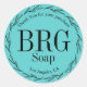 Delicar quadro redondo botânico com personalizável Obrigado pelo texto de compra, iniciais de monograma, tipo de produto, neste caso sabão, e local onde a empresa foi estabelecida. Sobre o fundo Turquesa.
