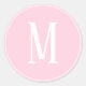 Um adesivo redondo clássico com um monograma branco sobre fundo de rosa claro. Personalize o adesivo com suas iniciais, cores de fundo, entre outras opções.