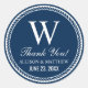 O adesivo favorito "Obrigado" do pré-disquete moderno apresenta um monograma inicial de dentro de um quadro de corda redondo e texto personalizado que pode ser personalizado com os nomes da noiva e do noivo e a data do casamento. esquema de cores azul e branco do marinho.
