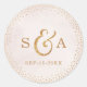 Glamor faux glitter rosa gold lettering calliografia monograma design e dourado confetti em fundo pastel blush watercolor, bonito shimmer falso efeito metálico rosa de ouro-ouro, moderno, chic, elegante e elegante, perfeito para casamento vintage ou casamento de primavera. Personalize seu próprio adesivo monograma e adicione um toque pessoal ao seu casamento! Veja todas as peças correspondentes nesta coleção de caligrafia de rosa dourada esfregada abaixo.