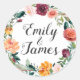 O adesivo de favor de casamento apresenta um monograma de na moda da noiva e nomes do noivo enquadrado por uma coroa floral russa com belos rosas de verão e queda, dahlias, flores de pénia e verde, em uma bela paleta de outono de vermelho, amarelo ouro, laranja cor de pêssego, rosa-pincel e tons de verde.