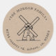 Adesivo de fazenda moderna com ilustração de moinho de vento circulada por um nome de família personalizado e endereço de devolução em uma fonte elegante.