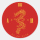 Um conjunto de autocolantes vermelhos adaptados aos seus convites de casamento de dupla felicidade. Eles apresentam um dragão de ouro sobre um pano de fundo vermelho sólido. De ambos os lados, está o monograma do casal a ser lançado em breve. Eles são um toque exclusivo e elegante para completar o pacote de seus convites e RSVPs.