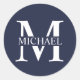 Presentes com Monograma e Nome Personalizados com monograma branco personalizado em estilo de fonte serif clássica com caixa de nome no meio do monograma em fundo azul marinho.