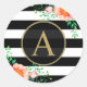 Etiquetas redondas chic com listras negras e brancas, um círculo negro com uma rica borda dourada e um monograma dourado, adornadas com belas ricas rosas de aquarela cor rosa e folhagem.