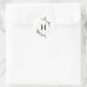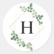 Um adesivo de casamento com um desenho de folhagem botânica inspirado em aquarela em torno de uma moldura geométrica com monograma preto.