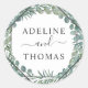O elegante casamento favorece adesivos com estilo orgânico moderno, combinando um quadro de diamante geométrico com folhagem verde botânica e bela tipografia. O design de verde de aquarelas inclui uma coroa de eucalipto, folhas e galhos de eucalipto de prata em tons vermelhos macios de menta, verde, oliveira e verde-azul-muda. Perfeito para um evento de primavera ou verão. O texto do monograma do casamento preto pode ser personalizado com os nomes da noiva e do noivo.