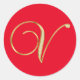 Ornamentado monograma V de ouro em fundo vermelho brilhante.