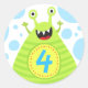Os adesivos de quarto aniversário, bonitos e divertidos, com um monstro ou alienígena feliz, verde, listrado com um "4" azul num círculo branco, amarelo, com uma borda laranja na barriga. O monstro está feliz e parece que ele está aplausos. Design brilhante e colorido para crianças, excelente como adesivos decorativos ou como selos de envelopes para meninos ou meninas, convites de festas de aniversários terceiros. Existem outros produtos de coordenação.