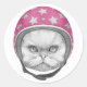 Este design apresenta um retrato de um gato persa com um capacete de motociclista rosa.