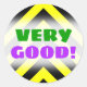 Este design de adesivo apresenta um padrão em forma de chevron preto e amarelo. Também apresenta a mensagem encorajadora "MUITO BOM!" em texto verde e roxo. Os adesivos como estes poderiam talvez ser usados por professores, educadores ou tutores para reconhecer e encorajar um estudante que fez um trabalho muito bom em um teste, teste, papel, projeto ou alguma outra tarefa escolar ou acadêmica. [~Z0000118]