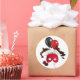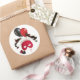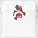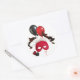 Um adesivo redondo com a imagem de uma máscara de penas vermelhas, balões vermelhos e pretos, um coração rubi e um coração preto sequido. Ver vinheta de vinilo cortada por medida, confetti, bolsa de favor, caixa de favor, etiqueta de favor, sacos de presente, etiqueta e papel de embalagem. Veja toda a coleção do Cancan Sticker nos CONVITES | Seção Stickers & Labels