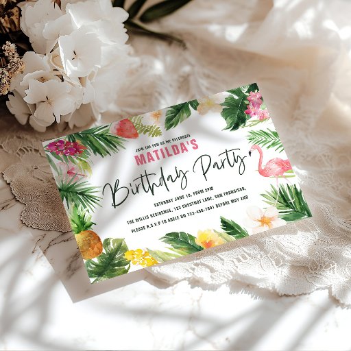 A folhagem tropical brilhante permite que a festa de aniversário seja favorecida por adesivos. Um design de aquarela moderno brilhante. Flores tropicais divertidas, fruta de verão e flamingos. Parte de uma coleção tropical brilhante.
