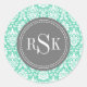 Cor damasco branca, cinzenta e tensa num fundo verde de menta com uma placa de identificação de cinza escura com um monograma triplo. Fácil de personalizar primeiro, último e médio design de padrão moderno feminino.