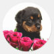 Rottweiler Puppy com belos rosas, um presente perfeito para amantes Rottweiler neste Namorados.