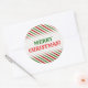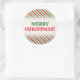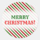 Esta design de etiqueta de Natal redonda apresenta um padrão de listras vermelhas, brancas e verdes. Estas são cores comumente associadas ao Natal. Também apresenta a saudação quente, "MERRY CHRISTMAS!", em texto vermelho e verde. [~Z0000114]