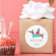 Um dachshund brincalhão em um suéter azul-turquesa e chapéu combinando carrega uma pilha festiva de presentes vermelhos, contra flocos de neve suaves para um visual caprichoso de Natal. A ilustração alegre combina charme e humor, perfeita para amantes de cães e celebrações sazonais. Personalize com o nome da sua família ou saudação para um toque final alegre.