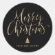 Adesivos personalizados de Natal apresentam caligrafia manuscrita em folha dourada falsa "Feliz Natal" e árvore em fundo preto, simples, moderno e elegante.