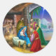 Natividade de Jesus com Jesus na manga. Mary e Joseph sentados ao lado do berço