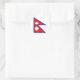 Bandeira do Nepal. A bandeira nacional do Nepal (nepalês: ने पा को झ ण् डा) é a única bandeira nacional não quadrilateral do mundo. A bandeira é uma combinação simplificada de dois pennons de solteiro, a palavra vexilológica para um galhardete. Até 1962, os emblemas da bandeira, o sol e a lua crescente, tinham rostos humanos. Eles foram removidos para modernizar a bandeira. A fronteira azul simboliza a paz e a harmonia que tem prevalecido no país desde a idade de Gautama Buddha, que era nascer no Nepal. O vermelho-creme é a cor nacional do Nepal, e indica os espíritos corajosos das pessoas nepalesas. Os dois triângulos simbolizam as montanhas do Himalaia e poderiam representar também as duas principais religiões, o hinduísmo e o budismo. A bandeira triangular vermelha é um símbolo hindu de vitória desde os tempos de Ramayana e Mahabharata. A representação dos corpos celestes representa a permanência, a esperança de que o Nepal dure tanto quanto o sol e a lua. A lua simboliza que os nepaleses estão calmos e calmos, enquanto o sol simboliza uma determinação feroz. A lua também simboliza as sombras e o legal tempo dos Himalaias, enquanto o sol simboliza o calor e a alta temperatura na parte inferior (Tarai) do Nepal. Outra interpretação: A forma da bandeira simboliza um pagode nepalês. Colocar um espelho na lateral da bandeira mais próxima do flagelo irá gerar uma imagem de um pagode.