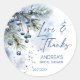 Adesivos de agradecimento personalizados do chá de noiva de inverno com tema neve no amor, modelo de adesivos personalizados com aquarela em azul empoeirado e bagas de inverno em galhos de pinheiro nevados, flocos de neve, adesivos personalizados para chá de noiva de inverno, suprimentos para festa de chá de noiva de inverno
