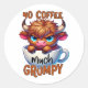 A funny and sarcastic colorful design showcases an adorable highland cow perched in an empty coffee cup. With a grumpy expression, big blue eyes, and brown fur, the cow adds a charming touch. The vibrant text reads, "No coffee much grumpy." This design is featured on a variety of products, making it a perfect gift for coffee enthusiasts.