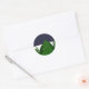Um céu azul profundo com estrelas e flocos de neve. Árvores verdes pintadas com neve recém-caída.