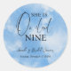 Elegante adesivo redondo de caligrafia azul aquarela para Chá de Noiva Clássico com título "Ela está nas nuvens".