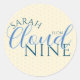 Este design apresenta adesivo de chuva de presentes de noiva moderno estilo nuvem 9 com tipografia de roteiro moderna "A noiva está na nuvem nove" e padrão de pontos em azul e branco. Todos os produtos são facilmente editáveis. Se precisar de ajuda com a personalização ou precisar de mais produtos desta coleção, por favor envie-me uma mensagem via Zazzle.