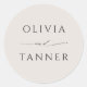 Este simples adesivo mínimo em bege neutro tem uma modelo para incluir os nomes da noiva e do noivo em fontes elegantes de serifa. Estes autocolantes versáteis são excelentes de usar como selos de envelopes ou em favores e presentes de casamento. A cor de fundo bege pode ser editada para qualquer cor desejada. Estes autocolantes estão disponíveis em 2 tamanhos; mostrados aqui no tamanho menor de 1,2 polegadas de diâmetro, eles também estão disponíveis com 3 polegadas de diâmetro.