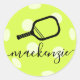 Os adesivos personalizados da bola de picleball impressos com nome personalizado ou texto em uma fonte feminina de giro e moderna bonito escrita e simples monograma de pickleball paddle, excelente para um convite de tênis de aniversário, favor ou presente. Use as opções de personalização do Zazzle para criar uma folha para cada convidado como um favor de retirada de uma festa de aniversário do clube de piquetes.