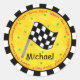 Você encontrará muitos usos para este adesivo redondo como fã de qualquer tipo de corrida materna. Personalize com seu nome ou com outras palavras ou parabéns - torne-o seu. Uma bandeira branca e preta ondulada está centrada em um fundo amarelo texturizado e tem uma borda branca e preta. As palavras vermelhas ao redor da dentro da fronteira e dizer Race Fan, Iniciar a corrida e bandeira verificada. As estrelas verdes estão sobre o fundo. Excelente para qualquer tipo de corrida - automóvel, moterciclone, bicicleta, derby e muito mais. Totalmente personalizável para uma festa à porta fechada ou para entretenimento para mostrar seu amor pelo esporte. Personalizável e coordenável com outros acessórios para um evento ou parte do excelente.