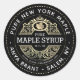 Personalize este rótulo com o nome do seu estado em texto curvo na parte superior deste rótulo. Ornamentado, Elegante Rótulo do Xarope de Cartaz Preto Redondo Redondo com uma folha de carpa de açúcar dourado. Borda de linha tracejada em ouro mutado. Seu nome e localização em texto curvado ao longo da parte inferior da etiqueta em branco para fornecer mais contraste e legibilidade a esta etiqueta. Informações de contato como e-mail ou telefone celular em texto curvo; volume de xarope de maple sob as palavras "Puro Xarope de Mapeamento" no centro do medalhão.