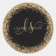 Vinheta Redonda de Monogramas Elegante com Glitter Dourado. Personalize facilmente este design de adesivo chic redondo com tendência, com brilho brilhante em ouro elegante sobre fundo preto. O design apresenta seu monograma manuscrito com espirais bonito e seu nome.