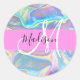 Menina rosa, pêssego e nome do monograma holográfico iridescente e adesivo redondo clássico inicial. Seu nome personalizado e monograma são escritos em um elegante roteiro escrito à mão com um fundo rosa. Um aniversário perfeito ou presente de Natal!