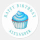 Adesivo de bolo de aniversário com um desenho de cupcake em aquarela azul com o texto 'Feliz Aniversário' e Seu Nome. Adicione este adesivo de aniversário a uma caixa de cupcakes ou a um presente/pacote de presente ou sele um envelope de cartão de aniversário com ele.