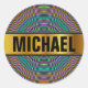 Este design de adesivo redondo apresenta um padrão de gravação que envolve vários círculos/anéis de várias cores. Ele também apresenta um nome personalizado em uma área falso de cor dourada.